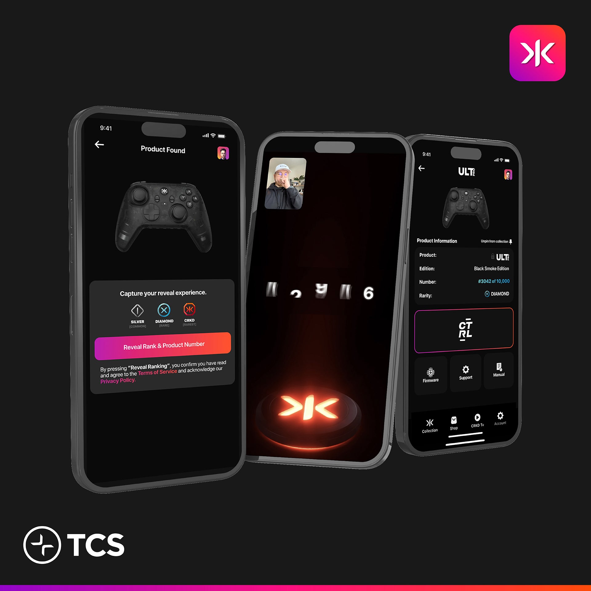 Users are guided through a unique reveal experience, unveiling their product number and rarity rank, with the option to securely add the collectible to their personal collection of CRKD products.